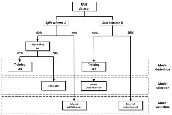 Graphic representation of the two schemes applied for dataset split. For each dataset, the function in model development (i.e., derivation, selection and validation) is reported.