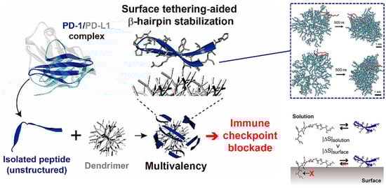 The peptide−dendrimer conjugate (PDC) platform has an enhanced immune checkpoint inhibitory effect due to the multivalent binding effect, and stabilizes the β-hairpin structure of the peptide via intermolecular forces and the excluded volume effect. Reproduced from Reference [23] with permission. Copyright: 2020 American Chemical Society.