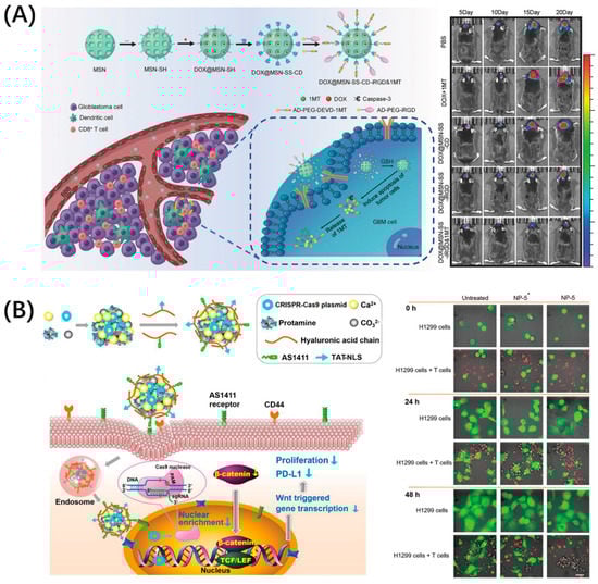 Peptide-functionalized nanomaterials for immune checkpoint blockade. (A) iRGD-modified nanoparticles, DOX@MSN-SS-iRGD&1MT, simultaneously delivered chemotherapeutic agent DOX and immune checkpoint inhibitor 1MT into orthotopic glioma, which exerted a superior antitumor effect in vivo. Reproduced from Reference [28] with permission. Copyright: 2018 WILEY-VCH Verlag GmbH & Co. KGaA, Weinheim. (B) Peptide TAT-NLS with cell-penetration and nuclear-transport functions mediated CRISPR–Cas9 (gene editing technology, which modifies specific DNA of targeted genes) plasmid delivery for β-catenin knockout and blocked the PD-1/PD-L1 pathway to improve the antitumor immune response of immune cells. Reproduced from Reference [29] with permission. Copyright: 2020 WILEY-VCH Verlag GmbH & Co. KGaA, Weinheim.