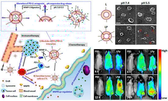 Combination immunotherapy with immune checkpoint blockade. pH and enzyme dual-responsive polymer–liposomes (LPDp) grafted with anti-PD-L1 peptide and encapsulating low-dose doxorubicin (DOX) for combination of cancer immunotherapy and chemotherapy. As shown in theTEMimages of L or LP with 2 mol % of pH-responsive polymer in PBS buffer solution, under the weakly acidic conditions of the tumor microenvironment, LP can respond to smaller nanospheres in order to avoid clearance by the immune system. And in vivo imaging has been proven it enriched at the tumor site with higher intensity. Reproduced from Reference [32] with permission. Copyright: 2019 American Chemical Society.