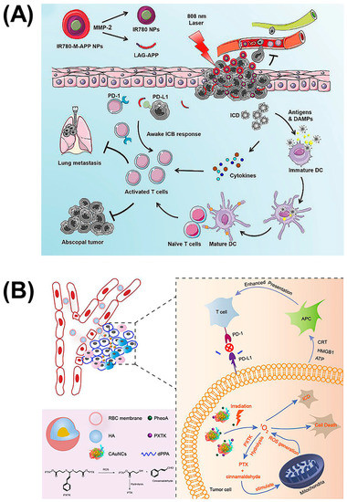 Self-assembled nanoparticles of reduced size combined with PDT to inhibit tumor metastasis. (A) Nanoparticles composed of photosensitizer IR780 and anti-PD-L1 peptide DPPA-1, which can be triggered to transition to a smaller size by MMP-2 for advanced cancers. Reproduced from Reference [42] with permission. Copyright: 2020 Elsevier. (B) Hyaluronidase-responsive size-reducible biomimetic nanoparticles (mCAuNCs@HA) enhanced anti-metastasis efficacy through combination with PDT. Reproduced from Reference [43] with permission. Copyright: 2018 Elsevier.