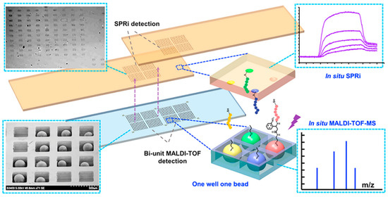 New methods for improving the speed of peptide screening. A high-throughput chip for screening, in which peptide beads were trapped in the microwell array for MALDI-TOF-MS detection and peptides were photocleaved in situ and imprinted onto the SPRi (surface plasmon resonance analysis imaging system) chips for SPRi detection. Reproduced from Reference [46] with permission. Copyright: 2014 American Chemical Society.