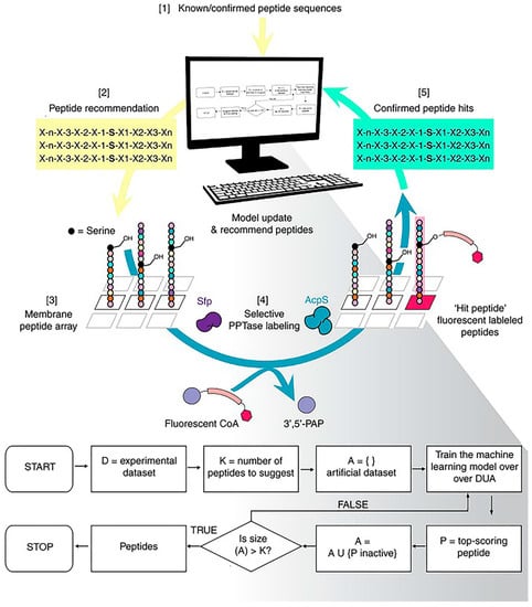 Machine-learning-based strategies for peptide screening. Using the peptide optimization with optimal learning (POOL) method to discover orthogonal peptide substrates for 4′-phosphopantetheinyl transferase. Reproduced from Reference [50] with permission. Copyright: 2017 Springer Nature.