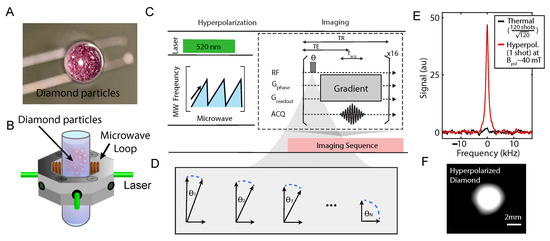 In the work, we use diamond particles (Figure 1A) as a prototypical platform to test the imaging sequences (Figure 1C,D) and to provide some theoretical understanding of the results as well as some insight into sequence design for imaging similar hyperpolarized materials. The hyperpolarization in diamond is enabled by one type of special atom-like defect—the Nitrogen Vacancy (NV) center [10] and a recently developed protocol [9,11]. The electronic spins of NV centers are optically polarizable to ≈99% at room temperature [10], and their long coherence time ensures its efficiency at polarizing surrounding C nuclear spins via chirped MW (Figure 1B,C). C imaging of natural abundance diamond powders (Figure 1F) is only possible with such highly polarized signal (Figure 1E). The ability to image micron/nanodiamonds through MRI can open up possibilities in directions including physics, chemical and biological analysis. For instance, hyperpolarized diamond particles that “light up” in MRI mode can potentially be applied as a targeting and tracking agent given their bio-compatibility and surface modifiability [11,12,13,14]. Additional advantage of high surface-to-volume ratio can also enable polarization transfer to external nuclei when brought into close contact with other chemicals for high-SNR and high-resolution NMR [15].