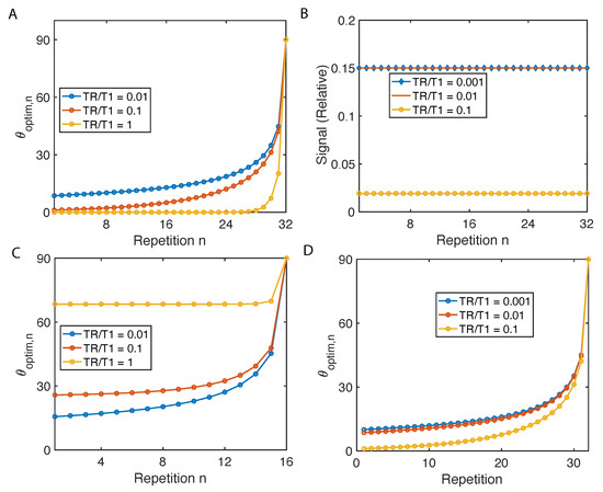 Appendix A.2. Variable Flip Angle for Maximum Cumulative Magnetization