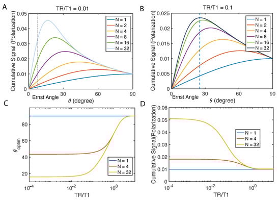 Similarly, we calculate cumulative signal: in Figure 3. Not surprisingly, there is an optimal flip angle given certain TR/T1 and total number of scans N. Under such optimal angle, the case of displays a more than 4 times higher cumulative signal than 90 pulse could (Figure 3A). When TR/T1 is less, increasing scan counts may become very effective for signal enhancement (Figure 3B). We compare this optimal flip angle with Ernst angle which is the flip angle for excitation of a particular spin that gives the maximal signal intensity in the least amount of time in the thermal polarization cases. We find that the optimal flip angle deviates from Ernst angle, however, approaching it when N increases.