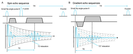 Spin echo and gradient echo sequence with small flip angle. (A) The pulse refocuses dephasing caused by field inhomogeneity, chemical shift, and gradients. (B) The reversed gradient refocuses the effect of gradients. The phase encoding dimension implements same gradient arrangement for both of the two echo sequences, and is omitted here.