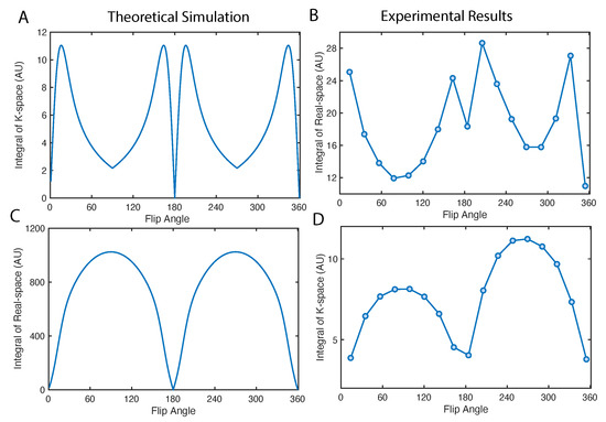 Total signal in k- and real- space as a function of flip angle. (A,B) The integration of absolute value in k-space is simulated and measured using the diamond particle phantom. (C,D) Display the integration of absolute value in real-space. The simulations are conducted assuming a uniform profile in real-space, i.e., constant, in which case only the effect of magnetization factor K is emphasized.