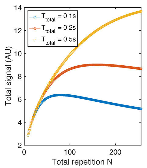 We would also like to discuss the total signal gained by the small tip angle RARE sequence. From Equation (13), we can tell that increasing number of echo trains will increase the signal, however extends the total acquisition times at the same time. Here we try to determine the optimal sequence design to maximize the total signal given a finite total time . We take the case where one is allowed to vary the flip angle, and the signal is constant in each repetition (as described in Equation (7)). We assume that in each repetition , where T is total number of echos within this repetition. We can rewrite Equation (13) to estimate total signal as a function of total repetition number :