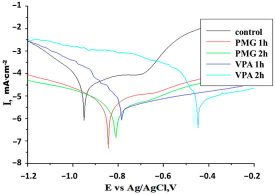 It can be observed that the Jcorr values for all inhibitors (Table 1) were lower than those for the “control”. The higher anodic currents for iron indicated that the iron suffers corrosion via its dissolution into ferrous and ferric cations. The differences observed for the values of Jcorr and Rp indicate better protection of carbon steel in the presence of PMG. In the presence of PMG, the lowest Jcorr and highest Rp were obtained: ≈5.76 × 10−6 A·cm−2 and 6.733 × 103 Ohm·cm−2 after 1 h and 3.67 × 10−6 A·cm−2 and 1.363 × 104 Ohm·cm−2 after 2 h of immersion. Experimental data show that the protection offered by the tested inhibitors is maintained over time and changes due to the adsorption of molecules at the metal surface. As the immersion time increases, the corrosion currents decrease, and the Rp increases in the case of PMG and decreases slightly in the case of VPA. Also, the values of the corrosion rate, CR was lower in the presence of PMG. The anodic polarization curves are shifted to positive values for all inhibitors. The values of cathodic and anodic Tafel slopes suggest some modification in the inhibition corrosion mechanism due to the adsorption process and to the formation of a protective layer at the active metal surface.