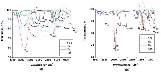 Decreasing the intensity and shifting to the lower wavelength of the characteristic absorption band at 3388 cm−1 related to the OH stretching mode of the molecules shows that as the immersion time increases, the number of free OH groups in films decreases, and they can participate in the formation of intermolecular hydrogen bonds. Moreover, the appearance of a new, broad absorption band at prolonged immersion time at 2550 cm−1 associated with O=P-OH…O sustains also the formation of hydrogen bonds (Figure 2a, highlighted zone) [38].