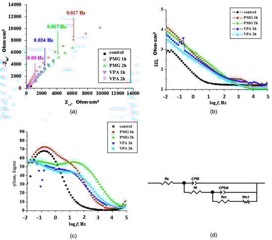 Figure 3a reveals an increase in the capacitive arc radius by adding inhibitors in the solution. The PMG and VPA present a similar form for capacitive arcs. The arcs are non-ideal semi-circles due to the frequency dispersion caused by the corrosion of metal and/or adsorption on inhibitors at the metal surface [45]. The kinetic parameters were obtained by fitting with an appropriate equivalent circuit (Figure 3d) and the resulting parameters are summarized in Table 2. The electrical circuit used consists of solution resistance—Rs, film resistance—Rf, charge transfer resistance—Rct, and a diffusional element W (Warburg element). The capacitive elements used, CPEf and CPEdl, represent the constant phase element of the film and the electrical double layer, respectively.