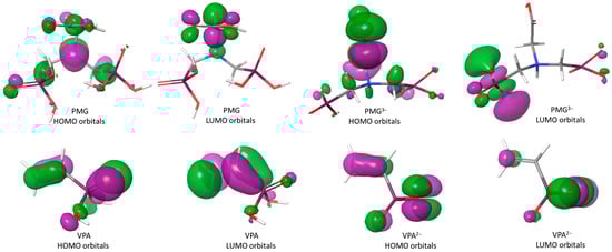 Highest occupied molecular orbital (HOMO) and the lowest unoccupied molecular orbital (LUMO) of PMG, PMG3−, VPA, and VPA2− compounds.