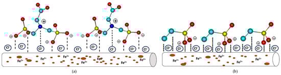 The action of PMG and VPA in saline solution at pH = 2.3 reveals that the studied phosphonic acids are capable of inhibiting the corrosion by controlling both the anodic and cathodic reactions. In acidic solutions, the inhibitors may exist as protonated species. These protonated species adsorb on the cathodic sites of the carbon steel and decrease the evolution of hydrogen. The decreases of anodic reaction can be achieved by adsorption on anodic sites occurs through the π-electrons of a double bond or by the lone pair electrons of nitrogen and oxygen atoms [64]. However, the VPA inhibitory value is slightly lower than the PMG, which may suggest that the nitrogen atom brings an additional contribution to the corrosion inhibition in a significant manner. The PMG molecules present in the solution can be in the form of zwitter ions, in neutral form, or protonated. Lone pairs of electrons of the O and N atoms agree to a stable interaction with the surface (Fe). Coordination through π-electrons of P=O and lone pairs of electrons to the d-orbitals of the Fe surface takes place as a result from experimental data and is in accordance with computational data. At pH ≈ 2.3, a fraction of PMG molecules can have a positive charge as a metal surface that is also positively charged. The repulsive force tends to make adsorption impossible. However, the experimental data show high values of Rct and surface coverage degree. Chloride ions adsorbed on the metal surface will create an excessive negative charge at the metal–solution interfaces, as can be seen in Figure 5.