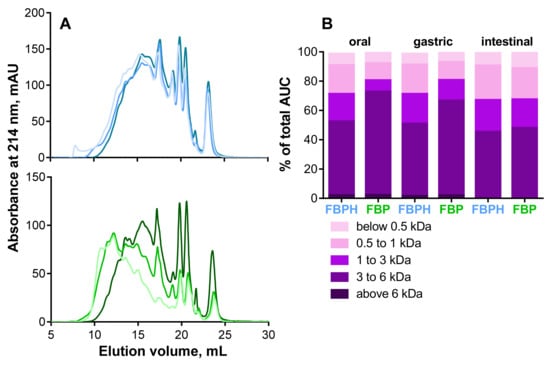 Peptide profiles and peptide molecular weight (MW) distributions. (A) Peptide profiles were obtained by size exclusion chromatography-fast protein liquid chromatography (SEC-FPLC): FBPH (blue curves), FBP (green curves); oral (light colored curves), gastric (colored curves) and intestinal (dark colored curves) digests. (B) The MW distribution of peptides in the different SGID compartments, expressed in percentage of total area under the curve (AUC), was calculated from the linear regression relationship which correlates the Log of known MW standard peptides and the elution volume.