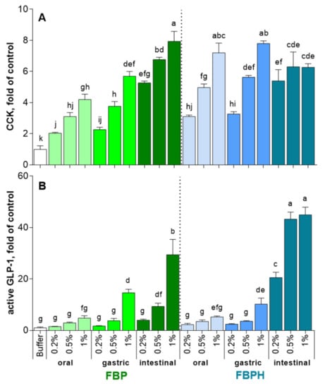 FBPH and FBP induction of intestinal hormones release during simulated GI digestion. The amounts of intestinal hormones released in STC-1 cells in the supernatants after 2 h of contact with the FBP and FBPH digests (2; 5 and 10 mg mL−1 w/v) were determined by radioimmunoassay for CCK (A) and active GLP-1 (B). Values are means ± SD and are expressed in fold of control (buffer). Means without a common letter within the same graph are significantly different (p < 0.05) using one-way ANOVA following by Tukey post-hoc test for pairwise comparisons.