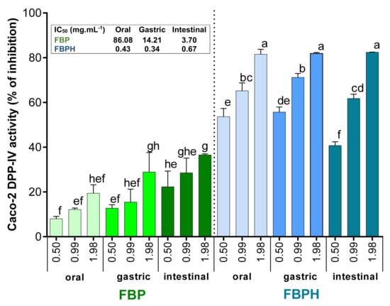 FBPH and FBP effects on the Caco-2 DPP-IV activity inhibition during SGID. The Caco-2 DPP-IV activity inhibition (%) obtained with FBP and FBPH digests assayed at increasing concentrations (0.5; 0.99 and 1.98 g L−1, w/v). Means without a common letter within the same graph are significantly different (p < 0.05) using one-way ANOVA followed by Tukey post-hoc test for pairwise comparisons. Inset: IC50 were determined by linear regression correlating the DPP-IV activity inhibition percentage and the Ln of the concentration.