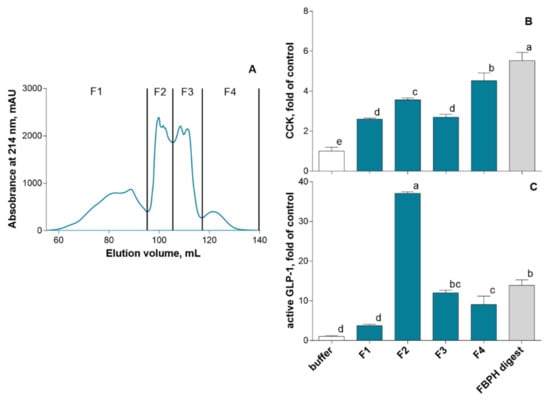 To identify active peptides able to stimulate the secretion of intestinal hormones, we first performed the SEC fractionation of the FBPH intestinal digest (Figure 4A). Four fractions were recovered and put in contact with STC-1 cells at 5 mg mL−1 (w/v) for 2 h. Results obtained showed that all of them were able to stimulate CCK secretion with the F2 and F4 fractions that displayed the higher potential with 3.5- and 4.5-fold of the control CCK secretion level, respectively (Figure 4B). Regarding GLP-1, the F2, F3 and F4 fractions were able to stimulate its secretion in STC-1 cells. The F2 fraction exerted a broadly higher potential than other fractions with 37 FOC and 2.6-fold of the FBPH digest (Figure 4C).