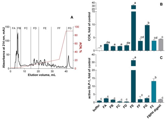 SEC-F2 RP-HPLC fractionation effect on gut hormones release in STC-1 cells. The RP-HPLC fractionation of the FBPH intestinal digest’s SEC-F2 fraction was performed using a C18 Gemini column (150 × 10 mm, particles of 5 μm, 110 Å, Phenomenex) with an ACN gradient represented in red (A). The amounts of intestinal hormones released in the supernatants, after 2 h of contact, with the subfractions, the SEC-F2 fraction and the FBPH digest (0.5% w/v), were determined by radioimmunoassay for CCK (B) and active GLP-1 (C). Values are means of three repeated measurements and are expressed in fold of control (buffer) ± SD. Means without a common letter within the same graph are significantly different (p < 0.05) using one-way ANOVA following by Tukey post-hoc test for pairwise comparisons.