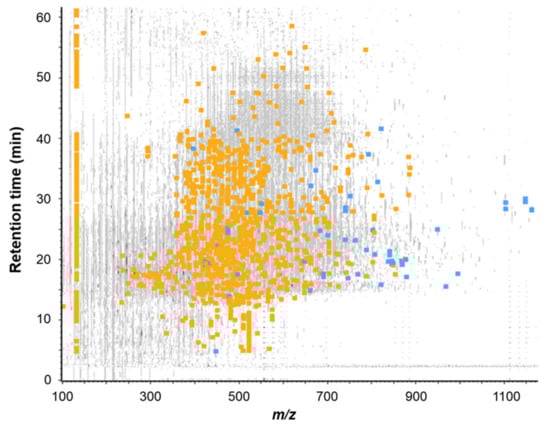Mass signal 3D-map of the FE subfraction issued from the RP-HPLC separation of the FBPH intestinal digest’s SEC-F2 fraction. Peptide map showing the repartition of all peptides detected by RP-UPLC-MS/MS analysis according to their retention time during chromatography, their mass to charge ratio (m/z) and their intensity. Grey signals represent all ions detected, blue squares represent identified peptides by database confrontation (false discovery rate (FDR) < 1%) and orange squares represent peptides sequenced by de novo mode (ALC score > 80%).