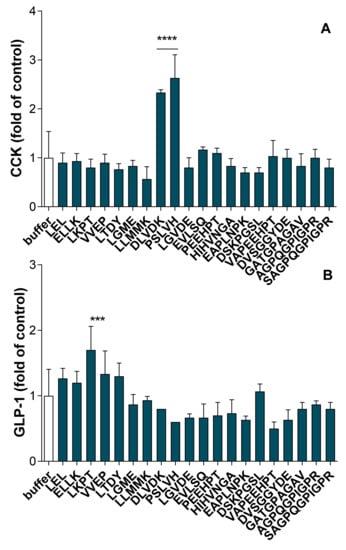 The synthetized peptides were put in contact with STC-1 cells for 2 h at a final concentration of 1 mM and the amounts of secreted CCK and GLP-1 were further determined by radioimmunoassay. As shown in Figure 7A, among the 20 peptides assayed almost two of them, DLVDK and PSLVH, were able to significantly stimulate CCK secretion (p < 0.0001). Regarding GLP-1, only the LKPT peptide was able to significantly stimulate active-GLP-1 release (p < 0.001) (Figure 7B).