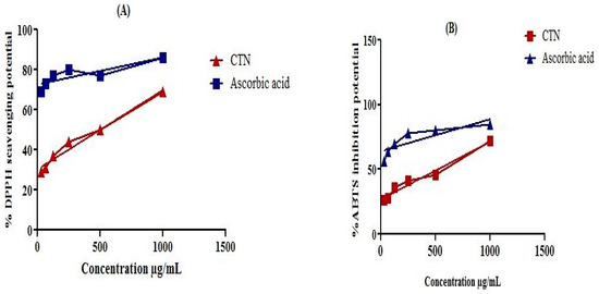 DPPH inhibition potential of CTN were 65 ± 1.35***, 50 ± 1.1***, 44 ± 0.5***, 37 ± 0.4***, 31 ± 1.0***, and 29 ± 1.4*** at concentration 1000, 500, 250, 125, 62.5, and 31.25 µg/mL with their IC50 values 65µg/mL. While the ABTS free radical scavenging potential of CTN were 59 ± 1.5**, 46 ± 1.8***, 41 ± 0.8***, 36 ± 1.4***, 28 ± 1.2***, and 21 ± 1.5*** at concentration 1000, 500, 250, 125, 62.5, and 31.25 µg/mL with IC50 values 72µg/mL. The results indicated in Figure 1A,B and Table S1 indicate that CTN has comparable % inhibition potential of the used free radicals to standard ascorbic acid against (ascorbic acid IC50; 30 µg/mL against DPPH and IC50; 32 µg/mL against ABTS). The experiments have been performed in three replicates.