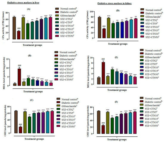 Figure 5 shows that administration of CTN (2, 5, 10, 15, 30, and 50 mg/kg body weight) has significantly (p < 0.05, p < 0.00 = 1, p < 0.001) reduced MDA level in STZ-induced diabetic rats. The high dose of CTN (50 mg/kg) was more effective as compare to low doses (10 mg/kg and below). CTN treated groups exhibited reduction in lipid peroxidation, observed through significant decrease of MDA level estimated in liver (Figure 5B) and kidney (Figure 5E) tissue homogenates in comparison to the diabetic control group. Furthermore, a significant increase in the concentration of reduced GSH estimated in liver (Figure 5C) and kidney (Figure 5F) tissue homogenates of the CTN treated groups in comparison to diabetic control group was also observed.
