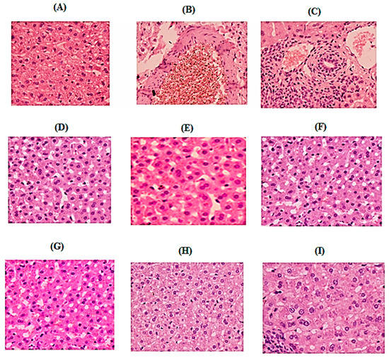 The effect of CTN administered in different doses on pancreas histopathology in STZ-induced diabetic rats is represented in Figure 6. The histological pattern of the pancreas of the normal control group has shown clear lobular architecture (Figure 6A). Islets of Langerhans were of normal diameter and structure, acinar cells were clear with prominent and centrally placed nuclei and interlobular spaces were also visible. The central cellular integrity and lobular structure of pancreas was retained. The effect of CTN on pancreas histopathology in STZ-induced diabetic rats indicates that a normal histological pattern of the pancreas was shown by the normal control group rats, as presented in Figure 6. Acinar cells were clear with prominent and centrally placed nuclei, and interlobular spaces were also visible. The islet of Langerhans was of normal diameter and structure and the overall cellular integrity and architecture was maintained. The pancreas of Diabetic control group rats (Figure 6B) showed a typical histological pattern with slight grade of congestion and dilated blood vessels with inflammatory cell infiltration. The diameter of islet of Langerhans was decreased with decreased cellular density. Shrined and pyknotic nuclei are also visible in the center of the islet. The boundary of the endocrine and exocrine portion of the pancreas was also indistinct. The presence of inflammatory cells can be observed in connective tissue spaces as well. The histological pattern of the pancreas of group III rats were treated with glibenclamide 5 mg/kg/orally (Figure 6C). The pancreatic tissue of this group of rats did not show any violation from the normal histological pattern during experimental period. No congestion or deterioration was observed in the in acinar cells. There was no reduction in the diameter of Islet of Langerhans and nuclei were also centrally placed. The boundary of endocrine and exocrine portion of pancreas was distinct and overall normal histological pattern was retained. The histological pattern of groups IV and V treated with CTN (2, 5 mg/kg/orally) did not show restoration of pancreatic tissue (Figure 6D,E). The diameter of the islet of Langerhans was declined with reduced cellular mass and the nuclei were not properly aligned. The presence of inflammatory cells and pyknotic nuclei were also observed to some extent, which showed that the CTN with dose 2, 5 mg/kg/orally was not effective to treat STZ-induced diabetes. Group VI-VII (CTN 10, 15 mg/kg/orally) has shown a little bit restoration of histological architecture of pancreas (Figure 6F,G). The size and number of Islet of Langerhans were recovered with low grade rejuvenation but still the distinction of septa between the islets and acinar is not prominent. The presence of inflammatory cells was negligible and the overall cytoplasmic integrity was retained to some extent. The groups VIII–IX (30 and 50 mg/kg/orally) show normal histological pattern of the pancreas with clear lobular architecture (Figure 6H,I). The isslet of Langerhans was of normal diameter and structure, acinar cells were clear with prominent and centrally placed nuclei and interlobular spaces were also visible. The central cellular integrity and lobular structure of the pancreas was also retained. These results showed that the maximum efficacy of CTN to treat diabetes is obtained at a doses of 30 and 50 mg/kg/orally in STZ-induced diabetes.