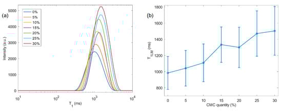 1H NMR longitudinal relaxation measurements. (a) T1 time distributions from the cellulose-based samples for various % of CMC (in legend), showing an increase in both intensity and T1 relaxation time. This is also shown in (b) by plotting the log-mean T1 values, calculated from the T1 distributions, as a function of CMC percentage. Error bars indicate the width of the distribution.