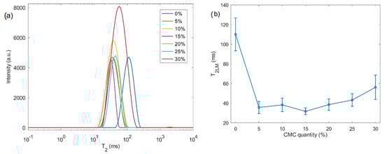 Transverse relaxation time (T2) NMR measurements were also performed. The results are displayed in Figure 3. The fitted T2 distributions (Figure 3a) revealed an abrupt shift towards lower T2 values upon the introduction of a minimal amount of CMC (5% w/w), followed by a progressive transition to higher times, as further presented in Figure 3b. An initial sharp drop in the log-mean transverse relaxation time (T2LM) value followed by a progressive increase with the amount of CMC is observed.