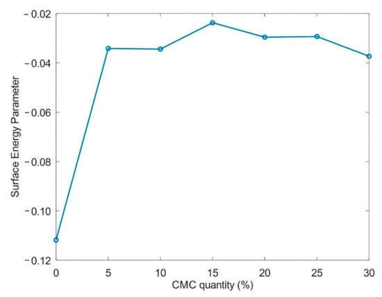 Esurf energy surface parameter as a function of the amount of CMC. This parameter shows the difference in energy interaction between the water molecules and the materials of different CMC contents. Upon adding the CMC, an initial increase in this parameter was detected, indicating a stronger interaction.