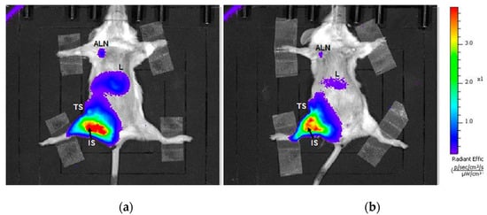 It is widely known that cancer is one of the leading causes of death worldwide, and despite the huge progress in cancer treatment over the recent years, many of the mechanisms involved in the complex process of tumor and especially metastasis development are still not fully understood. To address this deficit, efforts are being made to more precisely diagnose and treat metastasis spreading. Axillary lymph node (ALN) status serves as a metastasis prognostic factor. As an alternative to ALN dissection, sentinel lymph node (SLN) biopsy is used as a standard clinical procedure [,,]. SLNs play a key role in metastasis spreading as they form the lymphatic drainage system closest to the tumor and therefore, they are the most probable site of early metastasis []. However, SLN biopsy is still an invasive procedure with the possibility of complications. In addition to biopsy, various methods are used for metastasis and SLN detection, including standard blue-dye intraoperative detection and imaging methods such as magnetic resonance imaging (MRI) [,,], ultrasound [], single-photon emission computed tomography (SPECT), fluorescence, lymphoscintigraphy, and others [,]. Each method provides different information, but also comes with limitations, e.g., the low specificity of MRI and the optical signal attenuation. Multimodal imaging is used to overcome these issues. Combining MRI with sensitive and convenient optical imaging provides complementary and precise information on the anatomy as well as the distribution and degradability of contrast agents and drug delivery systems. Reliable imaging methods are crucial for improving both the accuracy of SLN detection and the efficiency of drug delivery systems. To that end, the ultimate goal is to create a specific, selective and non-invasive method of SLN metastasis prediction.