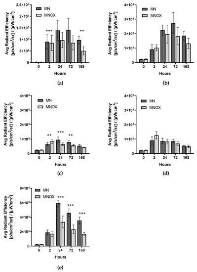 Quantification of fluorescence signals in different time intervals in vivo. Signals were quantified from (a) SLNs (inguinal lymph nodes on tumor site), (b) axillary lymph nodes on tumor sites, (c) axillary lymph nodes on non-tumor sites, (d) inguinal lymph nodes on non-tumor sites and (e) livers. The multiple one-tailed t-test was used for statistical evaluation (n = 9 for MN and n = 9 for MNOX). The fluorescent signal is represented as the average radiant efficiency (mean ± SD), p-values: *** p < 0.001, ** p < 0.01, * p < 0.05.