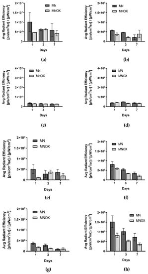 Due to the optical signal attenuation in the deeper organs (especially spleen and kidneys), the bio-distribution of the probes was assessed more precisely from ex vivo fluorescence signals (Figure 4, Figure S5) Ex vivo fluorescence signals from all organs decreased progressively over time (days 1, 3 and 7), with the exceptions of tumors and axillary and inguinal lymph nodes on tumor sites in the MNOX group. Fluorescence signal from ex vivo organs was higher for all organs from the MN group with two exceptions-tumors on day 3 and axillary lymph nodes on tumor sites on day 7. In these cases, fluorescence signal was higher in the MNOX group than in the MN group. In the MNOX group, we observed lower fluorescence signals, especially from kidneys (Figure 4f), spleens (Figure 4g) and livers (Figure 4h). However, the trend of gradual decrease of fluorescence signal over time was the same as for the MN group. Fluorescent signal from tumors was the highest on day 1 in the MN group and on day 3 in the MNOX group (Figure 4e), pointing to the slowing of biodegradation due to POX conjugation. In the MNOX group, there was a slight delay in the accumulation of fluorescent probes inside tumors.