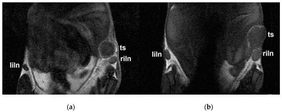 Representative coronal MR images measured three days after the injection of (a) MN or (b) MNOX into the right thigh muscle. Left inguinal lymph nodes (liln), tumors (ts) and right inguinal lymph nodes (riln) represent sites of polymer accumulation.