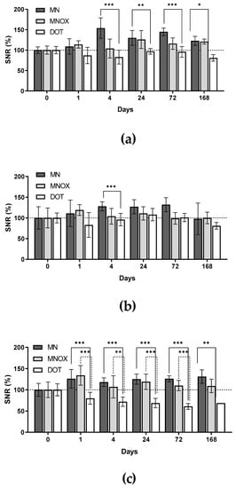 Quantification of MR measurements. Results are presented as the SNR percentage mean ± SD. Measurements performed before application of contrast agents are deemed 100%. Graphs show results from (a) inguinal lymph nodes on non-tumor sites, (b) inguinal lymph nodes on tumor sites (SLNs) and (c) tumors. The multiple one-tailed t-test was used for statistical evaluation (n = 9 for MN group, n = 9 for MNOX group and n = 6 for DOT group), p-values: *** p < 001, ** p < 0.01, * p < 0.05.