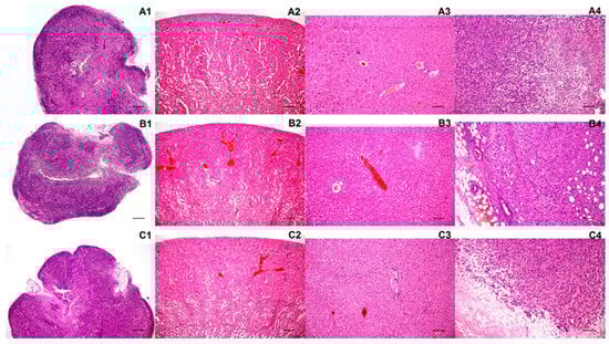 Histological analysis was performed in order to exclude pathological changes in the examined organs after the exposure to the mannan-based polymer carriers and to enable detailed monitoring of the induced tumors. No macroscopic or light-microscopic pathologies were observed for any of the investigated organs (Figure 7). Light microscopic examination revealed the preservation of tissue architecture, with no signs of dystrophic/degenerative change, necroinflammmatory activity or fibrosis. No unexpected neoplastic processes were discernible in the organs examined (Figure 7(A1–A3),(B1–B3),(C1–C3)). Histological examination of the induced tumors revealed uncircumscribed masses composed of poorly differentiated, frankly atypical neoplastic cells with hyperchromatic nuclei, markedly increased nucleo-cytoplasmic ratios, high mitotic activity, and atypical mitoses. Areas of coagulative necrosis were identified within neoplastic tissue.