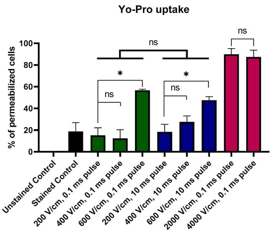 Permeability of melanoma cells as reported by the Yo-Pro uptake flow cytometry studies. Note that irreversible electroporation (IRE) protocols induce high-level permeabilization. Pulsed electric fields (PEFs) of lower intensities induce pulse-duration-dependent permeabilization. Black Bar represents control; green bars represent 200–600 V/cm, 0.1 ms pulses; blue bars represent 200–600 V/cm, 10 ms pulses; red bars represent 2–4 kV/cm, 0.1 ms pulses. Data presented as average ± SD. One-way ANOVA: * p < 0.05, ns p > 0.05.