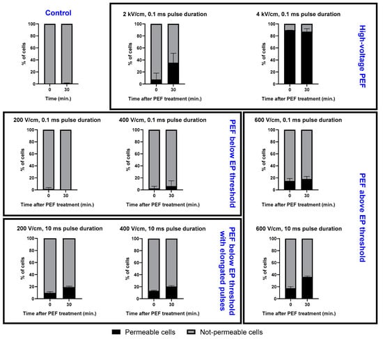 Trypan blue staining shows pore resealing after 30 min. PEFs below the EP threshold induce the pulse-duration-dependent permeabilization for the stain. Data presented as the % of cells ± SD.