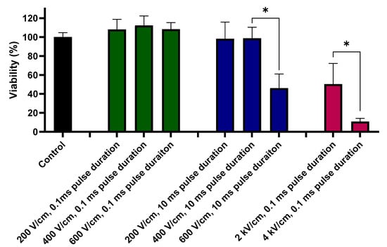 Viability (%) of the cells after standard IRE protocol (2 and 4 kV/cm, 0.1 ms pulse duration, 8 pulses), 200–600 V/cm, 0.1 ms pulse duration, 8 pulses PEFs and PEFs with the elongated pulse duration (200–600 V/cm, 10 ms pulse duration, 8 pulses). Green bars represent 200–600 V/cm, 0.1 ms pulses; blue bars represent 200–600 V/cm, 10 ms pulses; red bars represent 2–4 kV/cm, 0.1 ms pulses. Data presented as average ± SD. One-way ANOVA test analysis: * p < 0.0001.