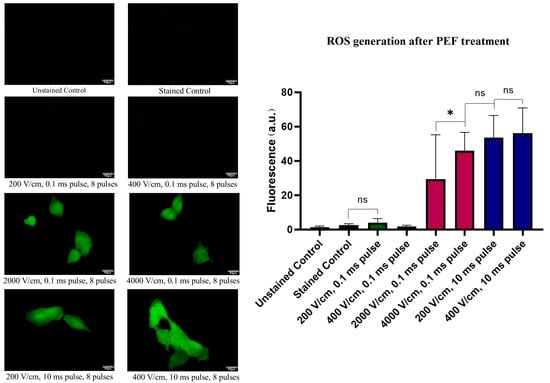 Oxidation stress induction 12 h after PEF treatment. The left side panel reports representative fluorescent photographs (40×) of the cells stained with CM-H2DCFDA. The right panel reports the statistical analysis of the samples. Green bars represent 200–400 V/cm, 0.1 ms pulses; blue bars represent 200–400 V/cm, 10 ms pulses; red bars represent 2–4 kV/cm, 0.1 ms pulses. The fluorescence of the samples presented as the mean ± SD. One-way ANOVA analysis: * p < 0.05, ns p > 0.05. Scale bar—40 μm.