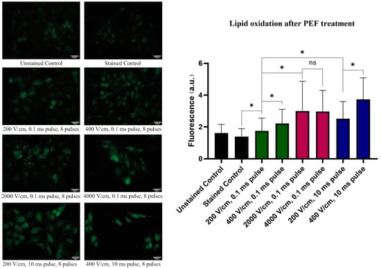 Lipid oxidation induction 36 h after electroporation. The left panel depicts representative fluorescent photographs of the cells stained with the Click-iTTM kit. On the right panel, the statistical analysis of the samples is provided. Green bars represent 200–400 V/cm, 0.1 ms pulses; blue bars represent 200–400 V/cm, 10 ms pulses; red bars represent 2–4 kV/cm, 0.1 ms pulses. The fluorescence is presented as the mean ± SD. One-way ANOVA analysis: * p < 0.05, ns p > 0.05. Scale bar—80 μm.