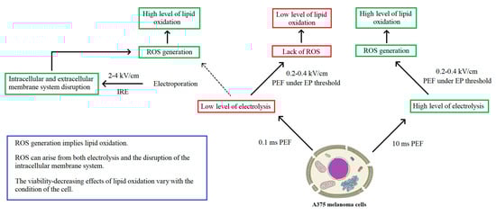 In the case of the 400 V/cm, 10 ms pulses, the generation of ROS may arise from both extracellular excessive electrolysis and the disruption of the internal membranous organelles. In contrast, 200 V/cm, 10 ms PEF does not induce any changes in the membrane morphology of the cell, and therefore ROS are probably originating mostly from the extracellular compartment. Despite the high ROS content and lipid oxidation after treatment ith 10 ms pulses, PEF below the electroporation threshold (200–400 V/cm) has no impact on the viability of the cells both instantly after treatment with PEF and after 24 h of incubation. The detailed mechanism is presented in Figure 8. The combination of electrolysis and electroporation has been proposed as a promising approach []. It is based on the hypothesis that electrolysis products after permeabilizing the cells can enter the cell interior and trigger cell death. Therefore, the combination of pulses may also provide additional cytotoxicity enhancing the effect of standalone IRE or electrolysis.