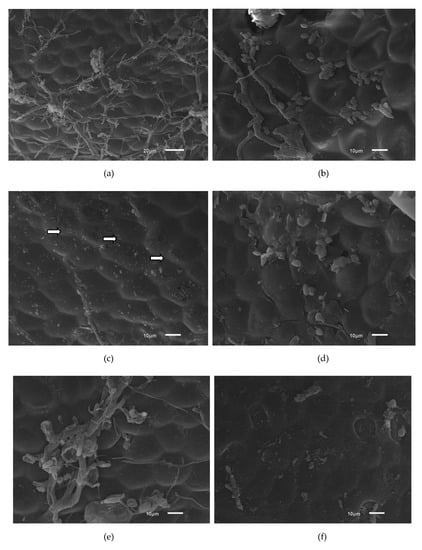 Figure 4d shows E. coli cells with changes to their morphology that may be related to the treatment with acetic acid since this acid is lipophilic and can cross the cytoplasmic membrane, destabilize the intracellular pH of the microorganism and cause cell disintegration []. In Figure 4e, the microbial cells are disrupted and exhibit morphological alterations. Acidification used to control the growth of microorganisms may lead to changes in bacterial cell morphology [].
