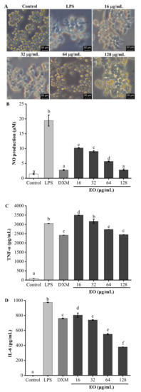 Figure 3. Effects of R. beesianus rhizome EO on the lipopolysaccharide (LPS)-induced morphology (200×) (A), nitric oxide (NO) production (B), and secretion of tumor necrosis factor-α (TNF-α) (C) and interleukin-6 (IL-6) (D) in RAW264.7 macrophages. (A) The RAW 264.7 macrophages were exposed to different EO concentrations and in the presence or absence of LPS (1 μg/mL). After 24 h of incubation, the images of RAW 264.7 cells were taken. (B) The RAW 264.7 cells were exposed to different EO concentrations and stimulated with LPS. Dexamethasone (DXM, 20 μg/mL) was used as a positive control. The accumulation of NO in the culture supernatants was assayed by the Griess reaction. (C, D) The RAW 264.7 cells were exposed to different EO concentrations and stimulated with LPS. The amount of TNF-α (C) and IL-6 (D) was determined using respective ELISA determination kits. The experiments were performed independently at least three times, and the data were expressed as the mean ± SD values. The different letters above bars indicate a significant difference (p < 0.05).