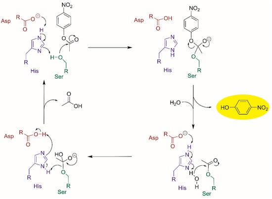 - Anderson, J.; Byrne, T.; Woelfel, K.J.; Meany, J.E.; Spyridis, G.T.; Pocker, Y. The Hydrolysis of p-Nitrophenyl Acetate: A Versatile Reaction To Study Enzyme Kinetics. J. Chem. Educ. 1994, 71, 715. [Google Scholar] [CrossRef]