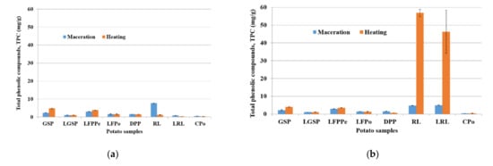 Figure 1b also shows that heating allowed a better extraction of the TPC on RL and LRL in aqueous ethanol compared to the corresponding samples obtained with methanol. Furthermore, RL and LRL exhibit a higher level than the other potato coproducts. This may be related to amount of anthocyanin and pigment, which confer the red color to this product. On the other hand, the Folin–Ciocalteu reagent can overestimate the total phenolic content, since it also reacts with hydroxyl groups in amino acids and sugars in addition to phenolic groups [29].