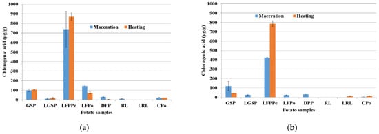 In the major potato by-products, the amount of chlorogenic acid in the maceration method was lower than those of the respective compounds obtained with the heating process. It seems that heat enhances the yield of extraction and the increases of chlorogenic concentration. The changes in the concentration of these compounds can be due to their heat-induced isomerization by heat and polyphenoloxidase action during the heating process, as reported by [32,39]. As shown in Figure 3, regardless of the operating conditions, relative concentrations on the chlorogenic acid according to different potato samples were in the following order: LFPPe > GSP > LFPo > LGSP > CPo.