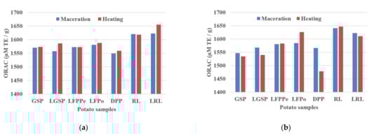 Antioxidant activities of orange-fleshed sweet potato are assessed as a function of cooking process types (Kourouma et al. [43]). The authors reported that in comparison to the untreated one, the boiling potato sample exhibited a significant high ORAC index (6.31 µmol TE/g) followed by steaming treatment (5.83 µmol TE/g) and then microwaving treatment 5.56 µmol TE/g). The literature data mentioned that the certain compounds generated during cooking of potato samples contribute to increasing the global antioxidant activities [43,44]. On the contrary, Tang et al. [45] reported that the cooking process could decrease the antioxidant activity by losing the bioactive molecules.