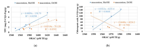 Correlation between total ORAC values and TPC contents (a) and chlorogenic acid (b) under maceration extraction with two solvents.